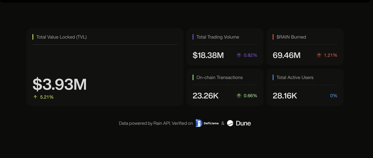 结果通过混合预言机系统确定,结合 AI 共识以提高效率,并为争议提供升级至人工监督的路径,确保准确性和抵抗操纵。自2025年11月6日测试版发布以来,Rain 已处理超过23,000个链上交易,并通过其通缩机制烧毁约6900万个 $RAIN 代币。