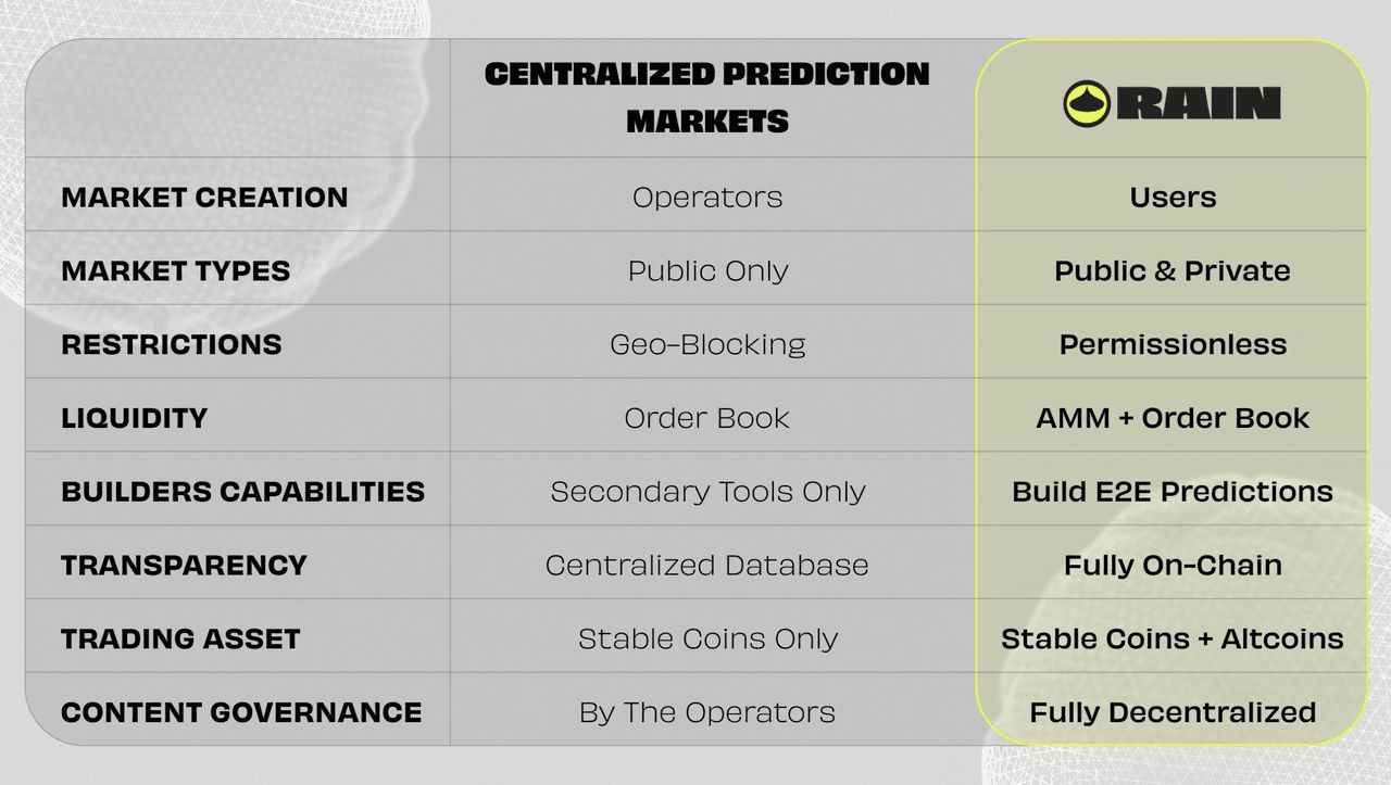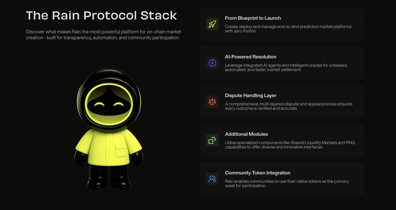 预测市场作为利用集体智能预测未来事件的有效机制,从重大选举到专业社区结果,人气激增。中心化平台往往对市场创建施加限制,遭受结算透明度问题,并经历漫长的结算时间。Rain Protocol 作为完全去中心化的基础设施层解决了这些问题。其公开测试版于2025年11月发布,确立了其作为预测市场的「Uniswap」地位,具备无许可的市场部署、AI辅助解决方案以及对公共和私人市场的支持。