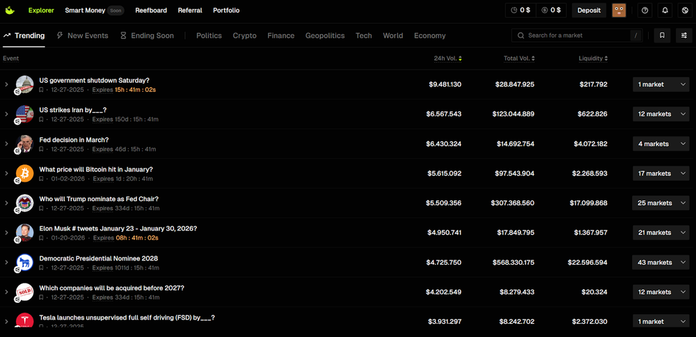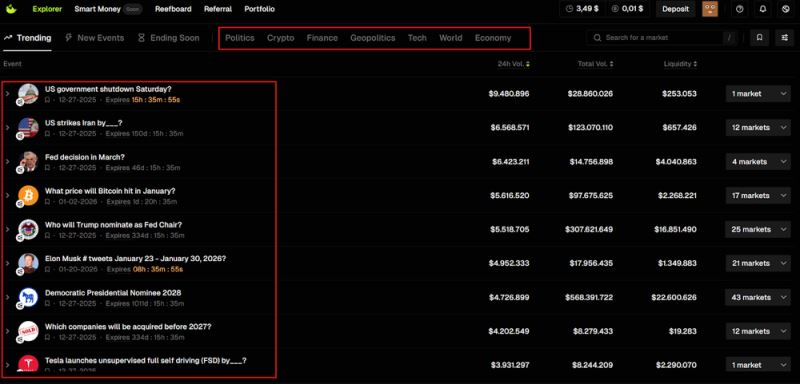 - 您可以按政治、加密货币、金融、科技、地缘政治等类别进行筛选。