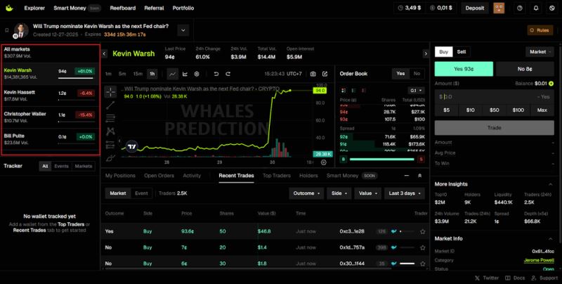 鲸鱼预测提供可视化的订单簿深度、汇总的市场数据和智能资金追踪功能。这些工具可帮助交易者更精准地下达限价单,获得更优惠的价格,并在多个预测市场中更早地发现交易机会。