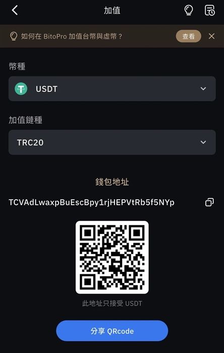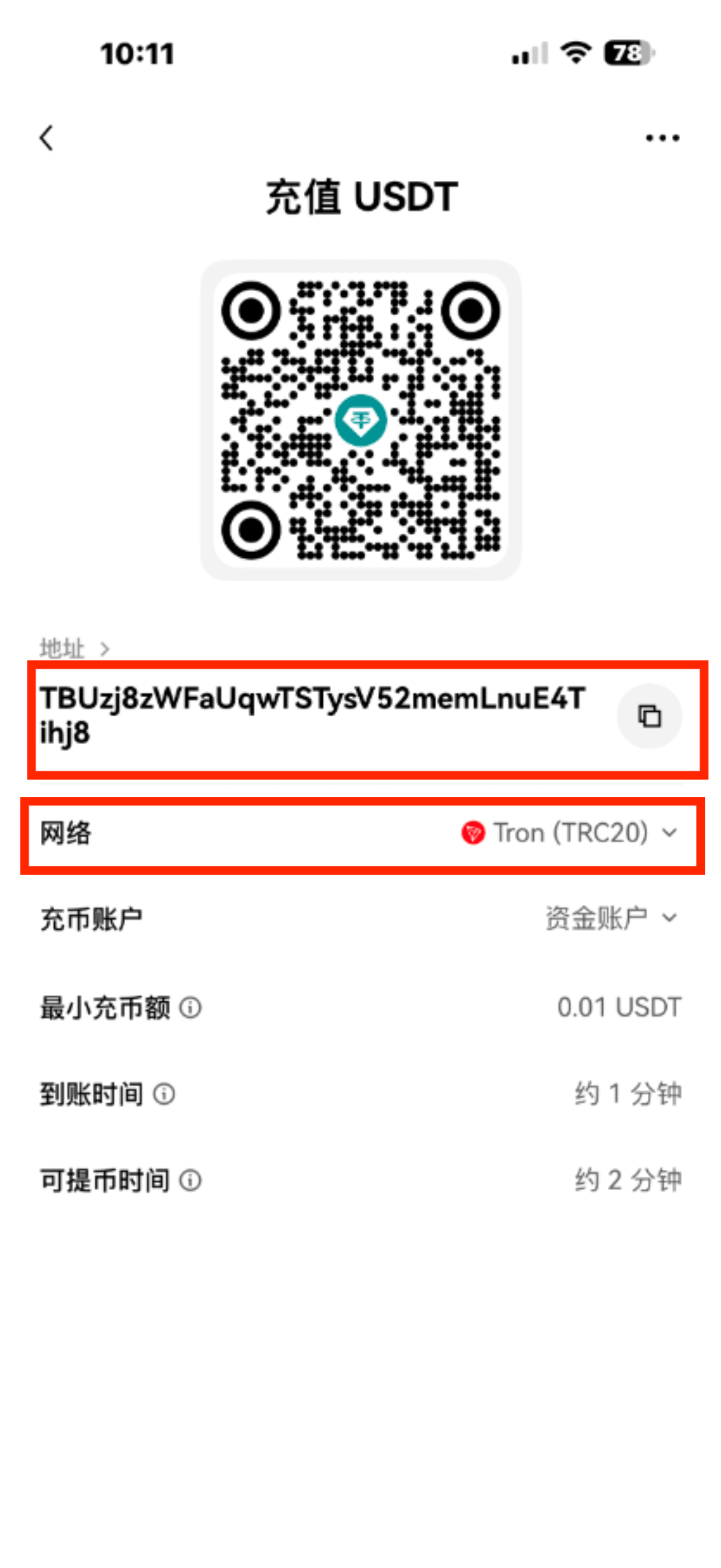 1、充值进交易所: 打开交易所,点击「充值 (Deposit)」,选择 USDT,并选定 TRC20 网络。 复制地址或扫描 QRcode,并发送 TRC20 的 USDT 进去。