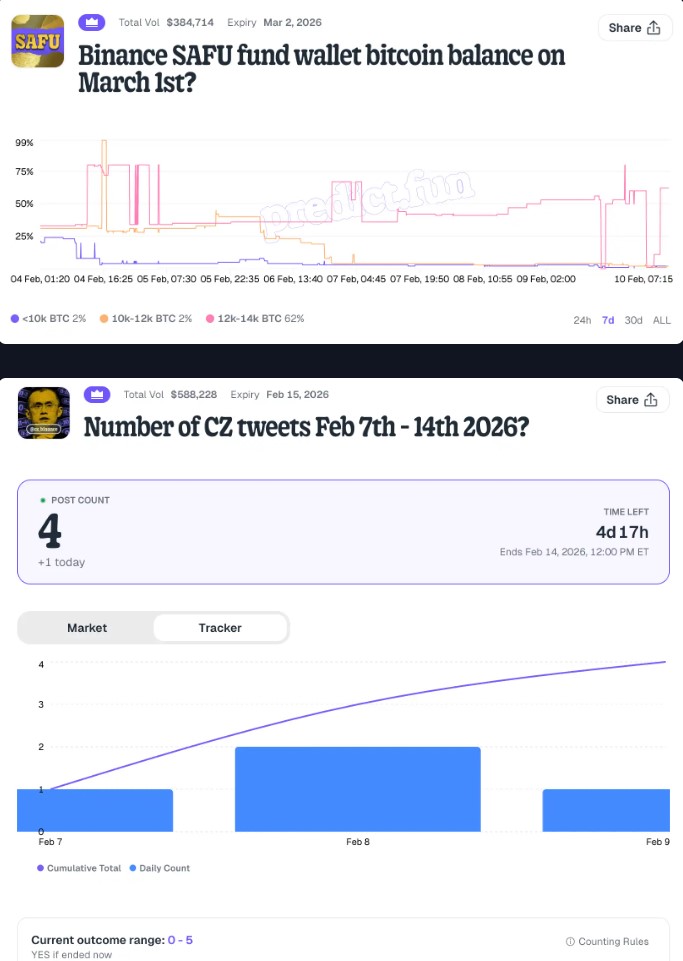除了产品机制与交互体验外,一些新兴预测市场平台在市场内容设计上也开始尝试差异化路线,即不再单纯复制 Polymarket 或 Kalshi 上已有的通用事件,而是围绕加密社区内部关注度较高的话题,推出更具圈层属性的「专属事件市场」。例如,predict.fun 上围绕 Binance 及社区热点推出的相关预测事件,包括「3 月 1 日 Binance SAFU 基金钱包比特币余额变化情况」、「CZ 在 2026 年 2 月 7 日至 14 日期间的推文数量」等,都属于更贴近加密用户日常讨论的话题类型。