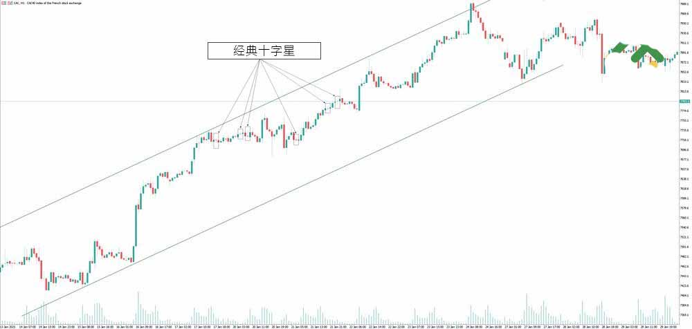 在经典的十字星形态中,开盘价应与收盘价一致,但有时两者之间会存在几个点的微小差异。因此,在根据此形态进行交易时,有必要通过其他烛台分析形态或技术指标来确认。