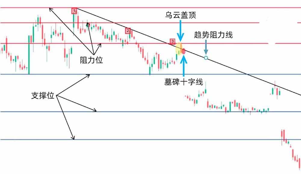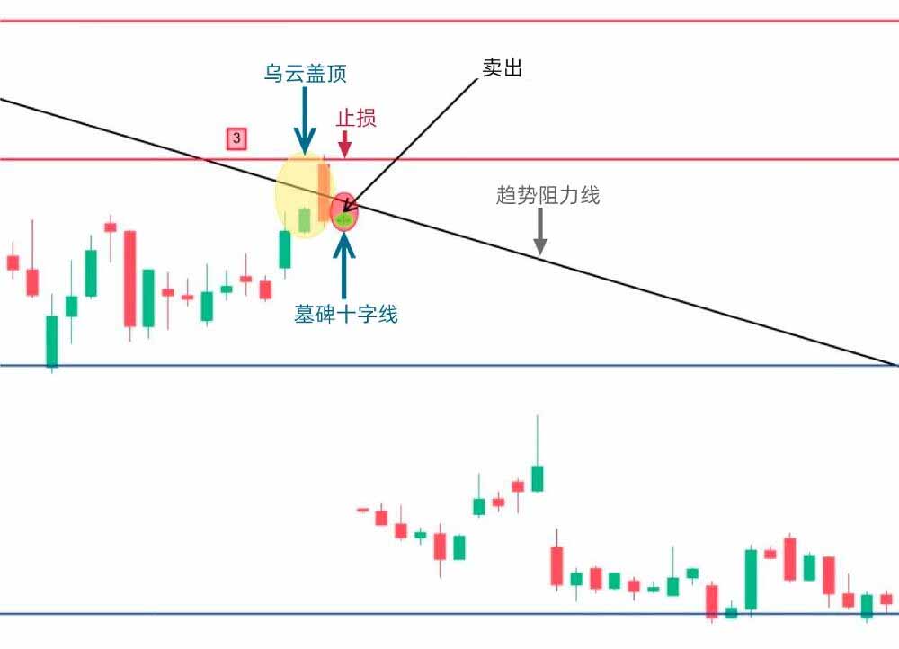 2. 确定下降趋势线后,下一步是分析第 3 点处的烛台图表。在此,我们可以看到,该资产价格向上修正之后,形成了乌云盖顶反转形态,随后出现了墓碑十字星。这些形态表明市场呈看跌态势。此外,价格试图突破阻力线后,空头力量在同一时期将价格推低。