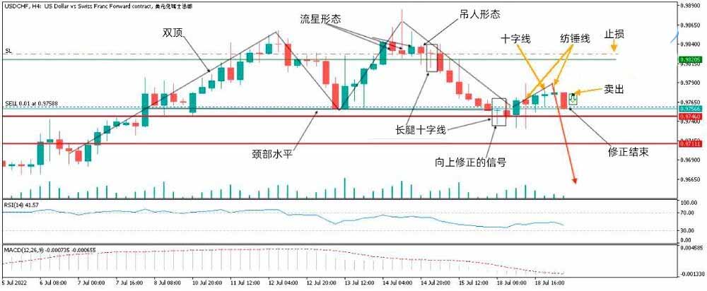 让我们看一个 4 小时图表上 USD/CHF(美元/瑞士法郎)货币对的实际交易示例。下图显示了一个双顶价格形态。由于在第二个顶点附近形成的流星、吊人和长腿十字星烛台呈红色,我们可以判断价格触及了一个强阻力区,但未能突破它。
