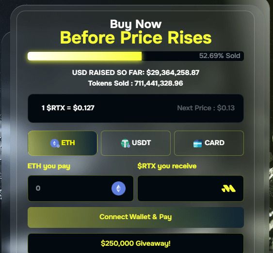 值得注意的是,截至撰写本文时,RTX 代币的折扣价仅为每枚 0.127 美元,但在此轮预售结束后,进入下一轮预售时,价格将上涨至每枚 0.13 美元。