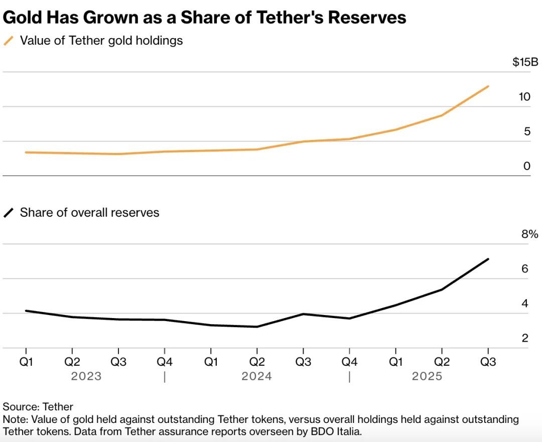 据彭博报道,约140吨黄金中的大部分是Tether自己的储备,以及支持其黄金代币的实物黄金。路透社援引Tether第三季度审计报告显示,截至9月底,支持USDT美元稳定币的储备中黄金价值129亿美元,按当时市场价格计算约合104吨黄金。截至去年12月底,用于支持XAUT代币的黄金为16.2吨。