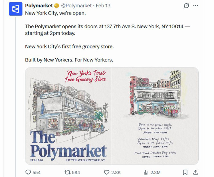 上周,基于区块链的预测市场平台Polymarket在纽约市开设了一家免费杂货店,并表示将在五个行政区捐赠300万份餐食。
