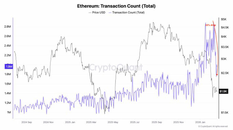 以太坊价格走弱也反映在其链上活动上,以太坊周三的日均交易量降至195万笔,较2月5日的290万笔下降了33%。
