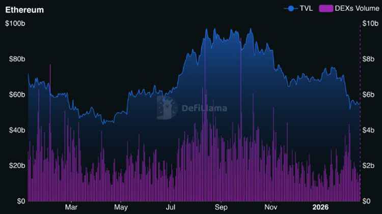 以太坊TVL与DEX交易量。来源:DefiLlama