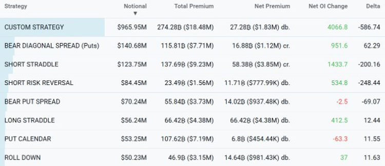 过去48小时Derbit上热门的BTC期权策略,单位:美元。来源:Laevitas.ch