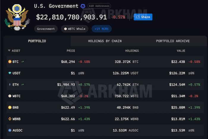美国政府的加密货币持有量,包括以太坊 | 来源:Arkham Intelligence
