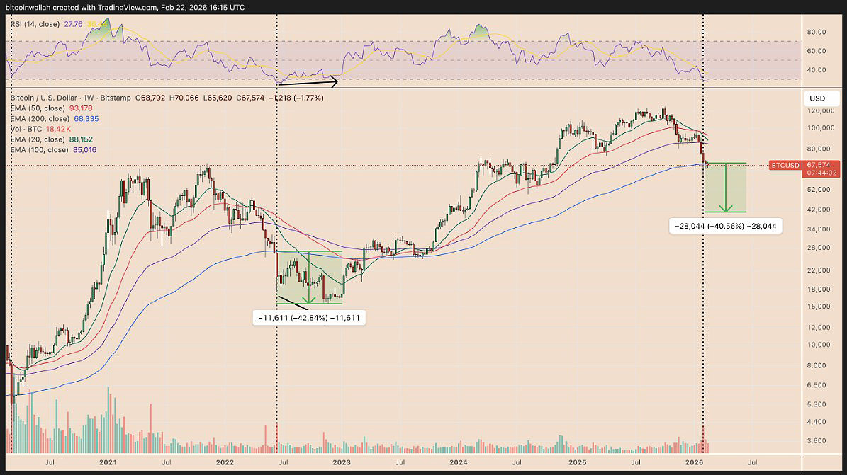 这可能引发2022年的局面,当时比特币跌破200周EMA后暴跌逾40%,尽管当时也处于类似超卖状态。