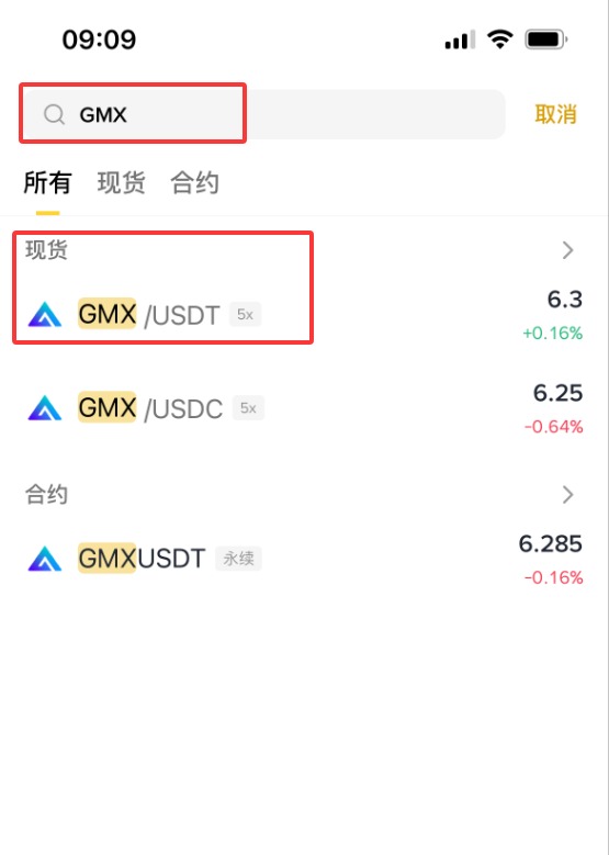 3、输入【GMX】,这时下拉会显示【现货】【GMX/ USDT】,点击【GMX/ USDT】。(作为新手,不建议做合约,所以这里就不演示合约购买方式了。)