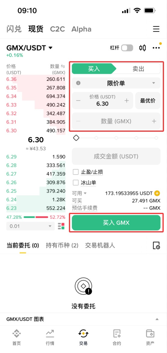 5、依次选择【限价单】-购买【价格】-购买【数量】-【成交数量】,设置好之后,点击【买入GMX】。