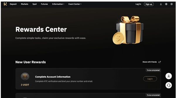 在其最新的加密货币交易所促销活动中,有一个新用户奖金,允许您完成简单任务并获得奖励。例如,仅注册即可获得 2 USDT。绑定您的 X 账户并分享 KCEX 邀请链接,可再获得 5 USDT。