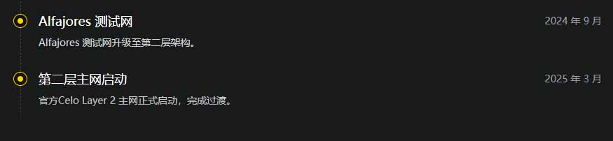 2024 年9 月:现有的Alfajores 测试网升级为L2 运行,让社群可以用真实基础设施测试迁移路径。 - 2025 年3 月:官方Celo L2 主网正式启动,完成整个过渡。