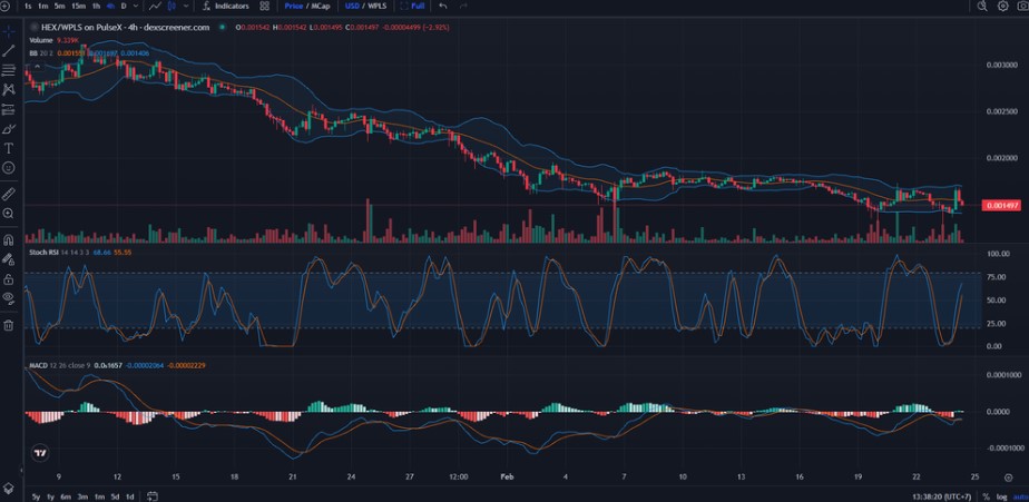 根据您分享的图表,可见的设置显示了包含布林带、随机相对强弱指标(Stoch RSI)、移动平均收敛扩散指标(MACD)和成交量的4小时HEX/WPLS图表。最明显的特征是显示期间内的广泛下行趋势,随后在最新的蜡烛附近出现了更为横盘的阶段。