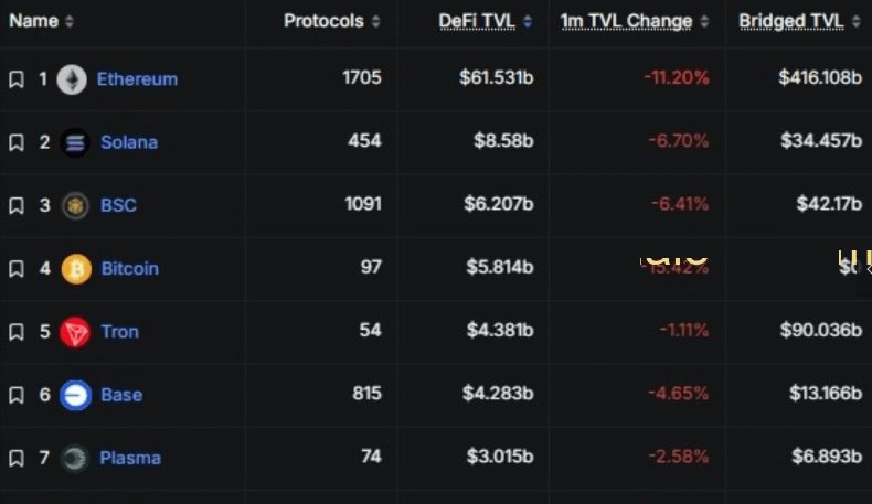 根据区块链数据平台Defillama最新统计,截至2026年初,Tron在Defi领域实际所藏价值约为43.81亿美元,在所有区块链中排名第五。略低于Bitcoin与BSC,但明显高于base、Arbitrum等新兴公链。