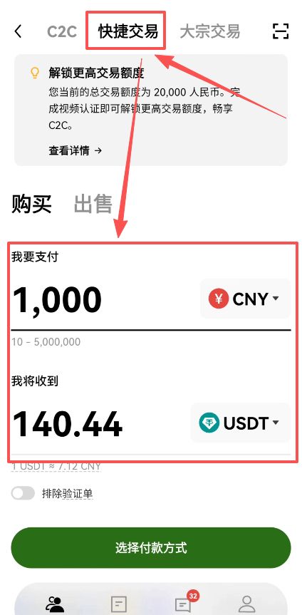 快捷区我们可以看到它类似于兑换,我们直接输入想要支付的金额,就能够去买USDT。不过这里要提醒大家千万不要去使用快捷交易进行出金,虽然它比较方便快捷,但是因为出金的风险远远高于入金。快捷交易是平台随机匹配的价格最优的商家,这个商家他的信用不一定是好的,他的资产不一定是安全的,所以在这里面进行出金,冻结风控的几率是更大的。