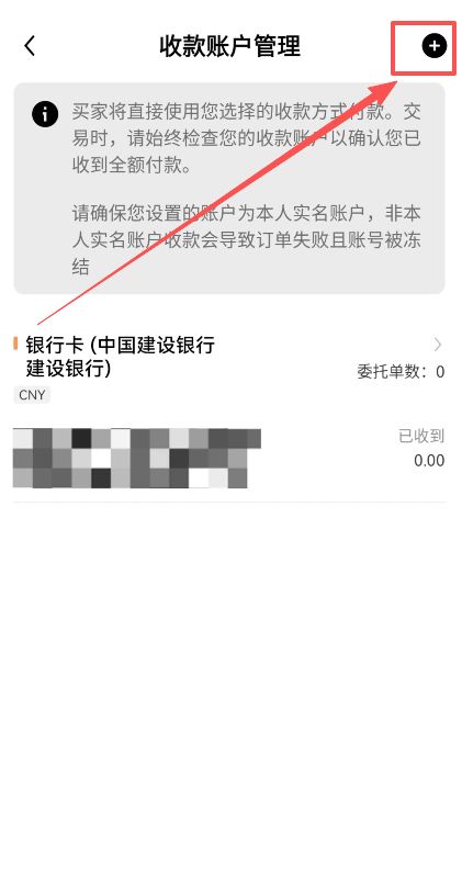 点开之后需要我们在这里添加上我们的收款账户,这样商家才能往我们的收款账户里面去打钱。我们点击右上角的+号。