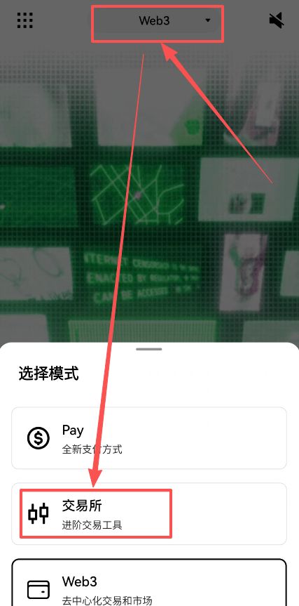 进入币安APP之后,你可能会发现你的页面是下图这样的,下面显示这里是欧易的Web3钱包。我们知道欧易的Web3钱包和欧易交易所的钱包是不一样的,我们就可以点击Web3这里,选择【交易所】。