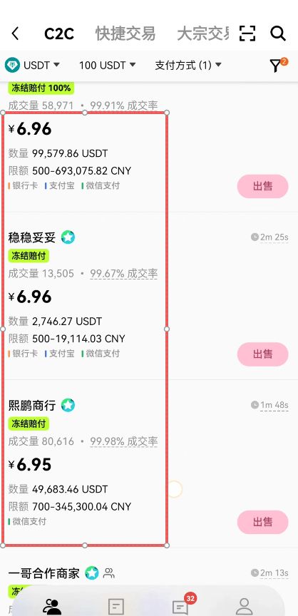 下面这些商家就是符合我们条件的商家了,首先我们来看一下它的报价,有两个6.96,剩下的是6.95。这里我们就忽略这两个6.96的商家,选择报价次之的6.95的这些商家。因为我们是要警惕这些高价收U的人的,高价收U别人打给你的钱就有可能是黑钱。而且如果说你不在交易所里面,你跑到社群或者是抖音、微博的评论区里,有一堆人找你说他能高价收你的U,千万不要大力他们,很容易出现问题的,大概率都是黑钱。别人想拿黑钱换你手里干净的USDT,所以他才会高价的去收你的U。