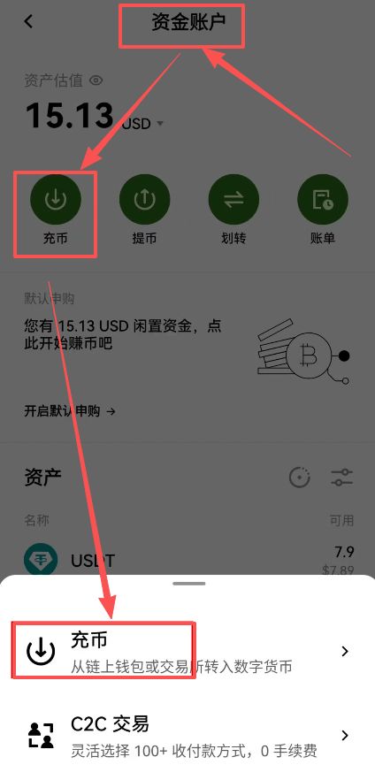 我们来到资金账户,在这里选择【充币】,再选择【充币】。