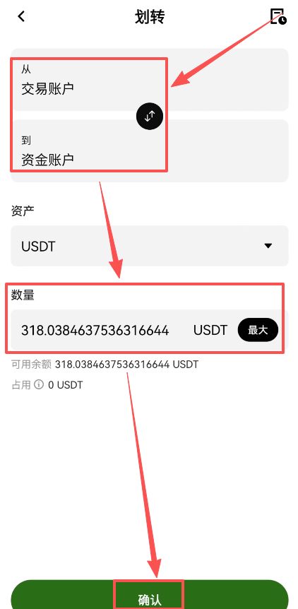 我们就把USDT通过划转的功能,给它划转到资金账户里面,然后统一再进行出金。我们选择从“交易账户”划转到“资金账户”,数量最大,点击【确认】。就划转完成了。