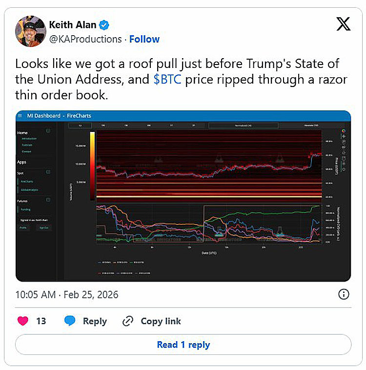 他告诉X平台的粉丝:“美国总统唐纳德·特朗普发表国情咨文之前,市场已提前消化了上行卖出流动性。”