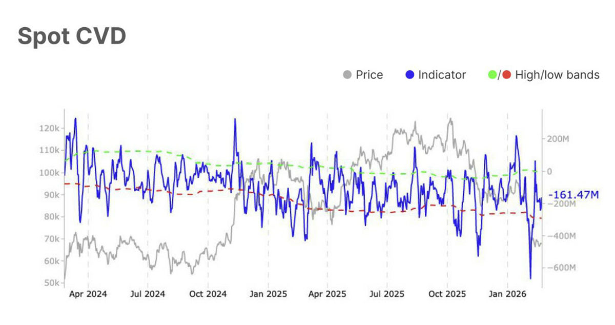 链上数据追踪比特币投资者收益率已回落至长期平均水平附近,表明估值可能正在经历一次重新调整。与此同时,加密货币交易所的订单流显示,激进的抛售压力有所缓解,尽管现货累计成交量差(CVD)仅小幅上升,但现货交易量却从76亿美元降至60亿美元。