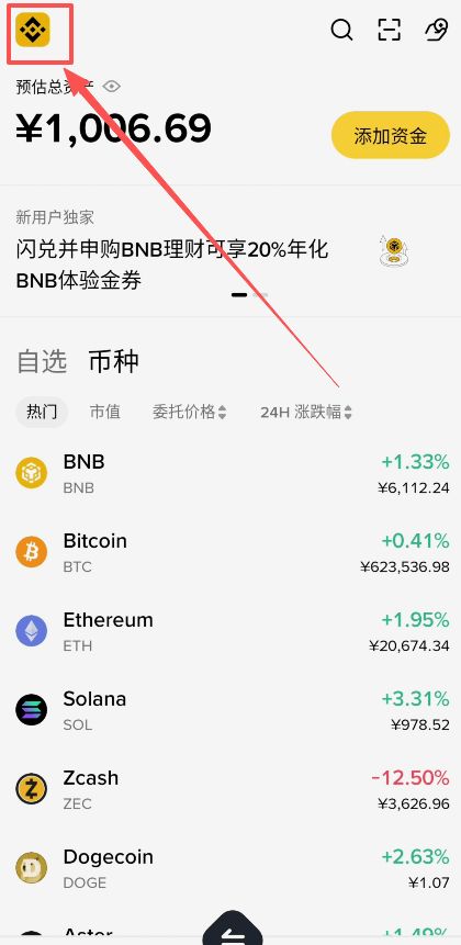 进入币安APP之后,你可能会发现你的页面是下图这样的简易版的页面。这时候就需要我们点击左上角的LOGO。