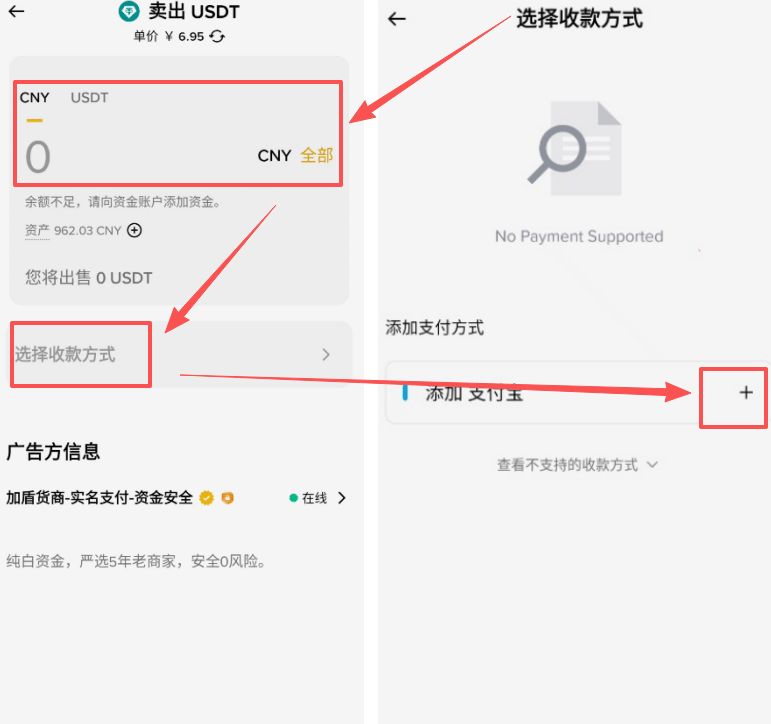 在这里面输入你想要出售的金额,或者USDT的数量,然后添加一下我们的收款方式,点击+号。