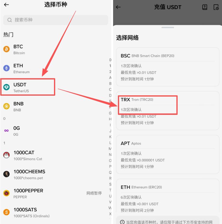 币种选择“USDT”,USDT它是和美元锚定的,也就是在币圈里面每一个USDT都是价值一美元的。这里需要我们选择它的网络,我们一般要选择的是TRC20这个网络,也就是TRX,也叫TRON。