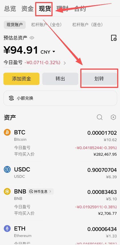 接下来我们就来看一看,你其他账户里面是否还有剩下的USDT。比如说我们来到现货账户里面,点击这里的【划转】。划转就是将USDT在上面的这堆账户里面来回的搬运,就好比把你的货物在几个不同的仓库里面来回搬运一样。它中间是不会收取任何手续费的。