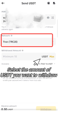 7.将从RedotPay复制的充值地址粘贴到提现地址处,并选择对应网络(请参考步骤3,以USDT-TRC20链为例,