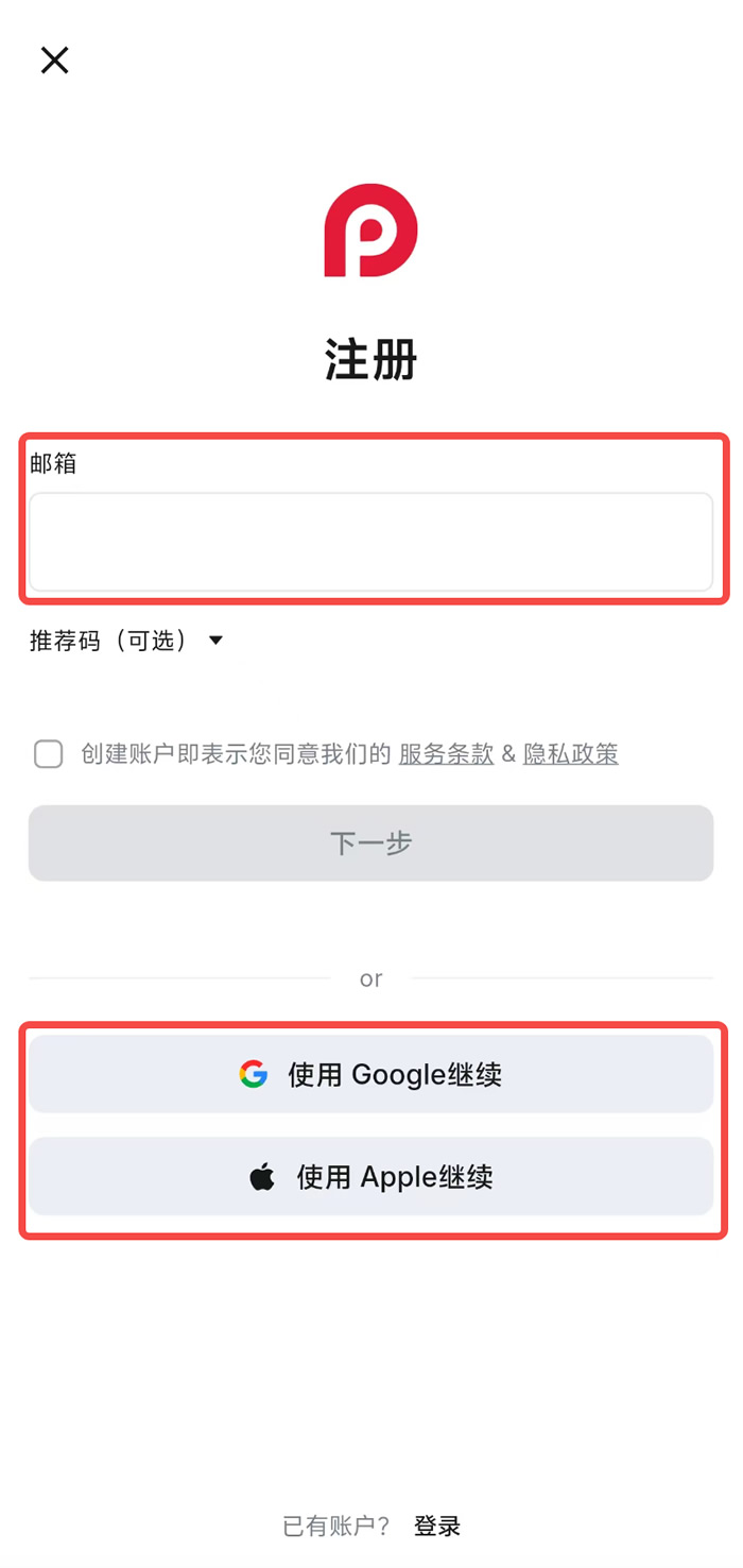 2、下载安装完成之后,使用邮箱,Google,Apple 注册RedotPay账号