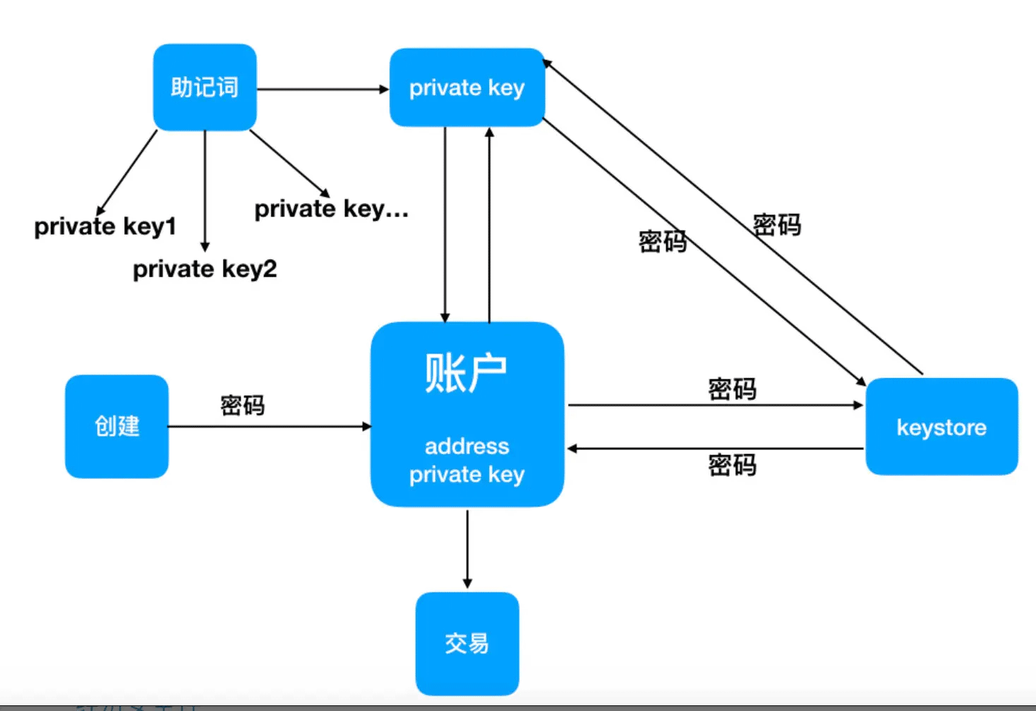 - Keystore + 密码 = 私钥:只有同时拥有Keystore文件和它的密码,才能还原出私钥,掌控资产。