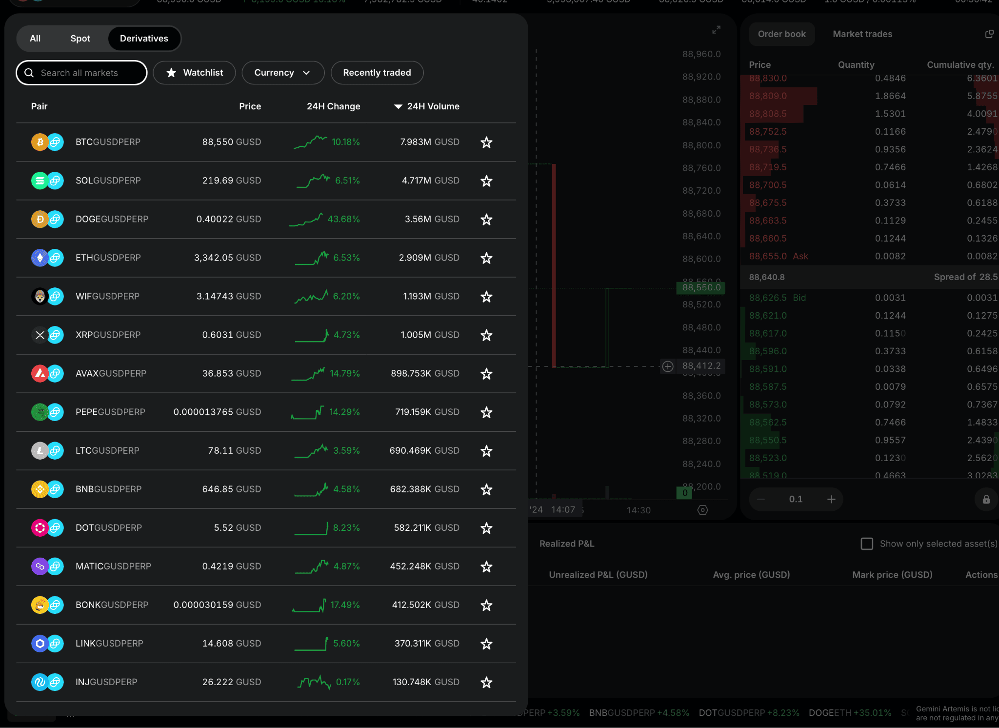 - Gemini 现货交易的流动性不好,市价单滑点很高,限价单一天后才成交。