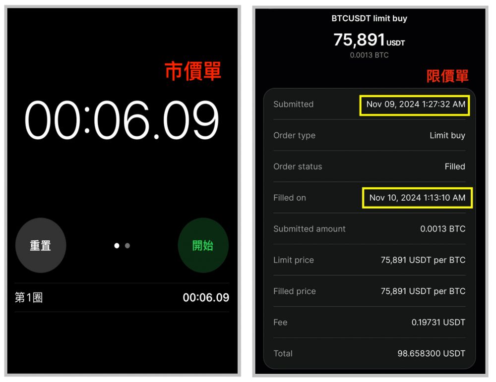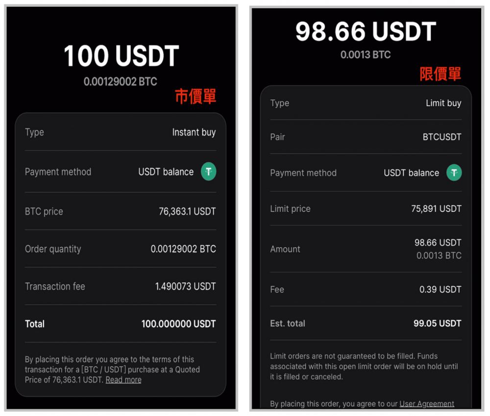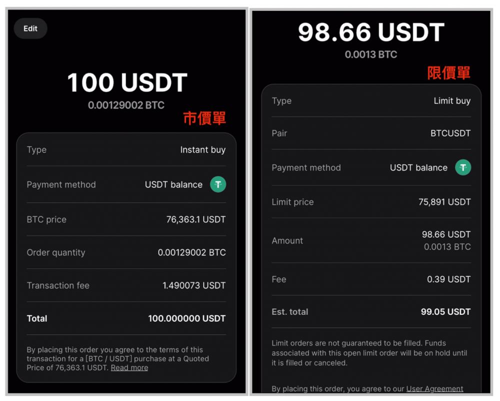 我用约100USDT 分别买入市价/ 限价现货的BTC,并且纪录了真实手续费、滑点。