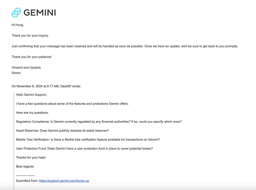 - Gemini 客服机器人回应时只会贴官网文章,提交问题表单未得到后台客服回复。