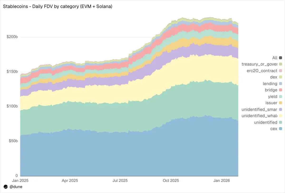 在 EVM 和 Solana 上,中心化交易所(CEX)是最大的已知分类,持有量达 800 亿美元,高于一年前的 580 亿美元。稳定币首要的身份依然是交易所交易和结算的基础设施。巨鲸钱包持有 390 亿美元。收益协议的持有量几乎翻倍,达到 93 亿美元,反映了链上收益策略的增长。发行方地址——国库和铸造/销毁合约——从 22 亿美元飙升 4.6 倍至 102 亿美元,这直接反映了有多少新供应量进入了市场。