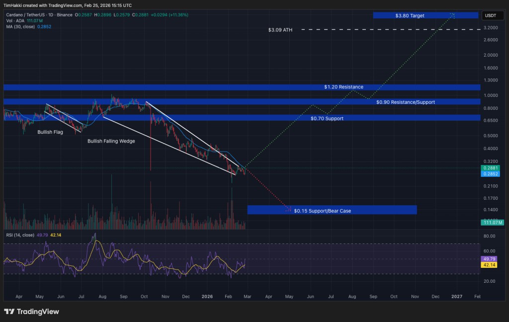 Grok 的预测显示,ADA 可能会激涨略超 1,250%,从目前的约 0.28 USD 攀升至 2026 年底的近 3.80 USD。如此幅度的波动将推动 Cardano 远超其 2021 年创下的 3.09 USD 的历史高点。