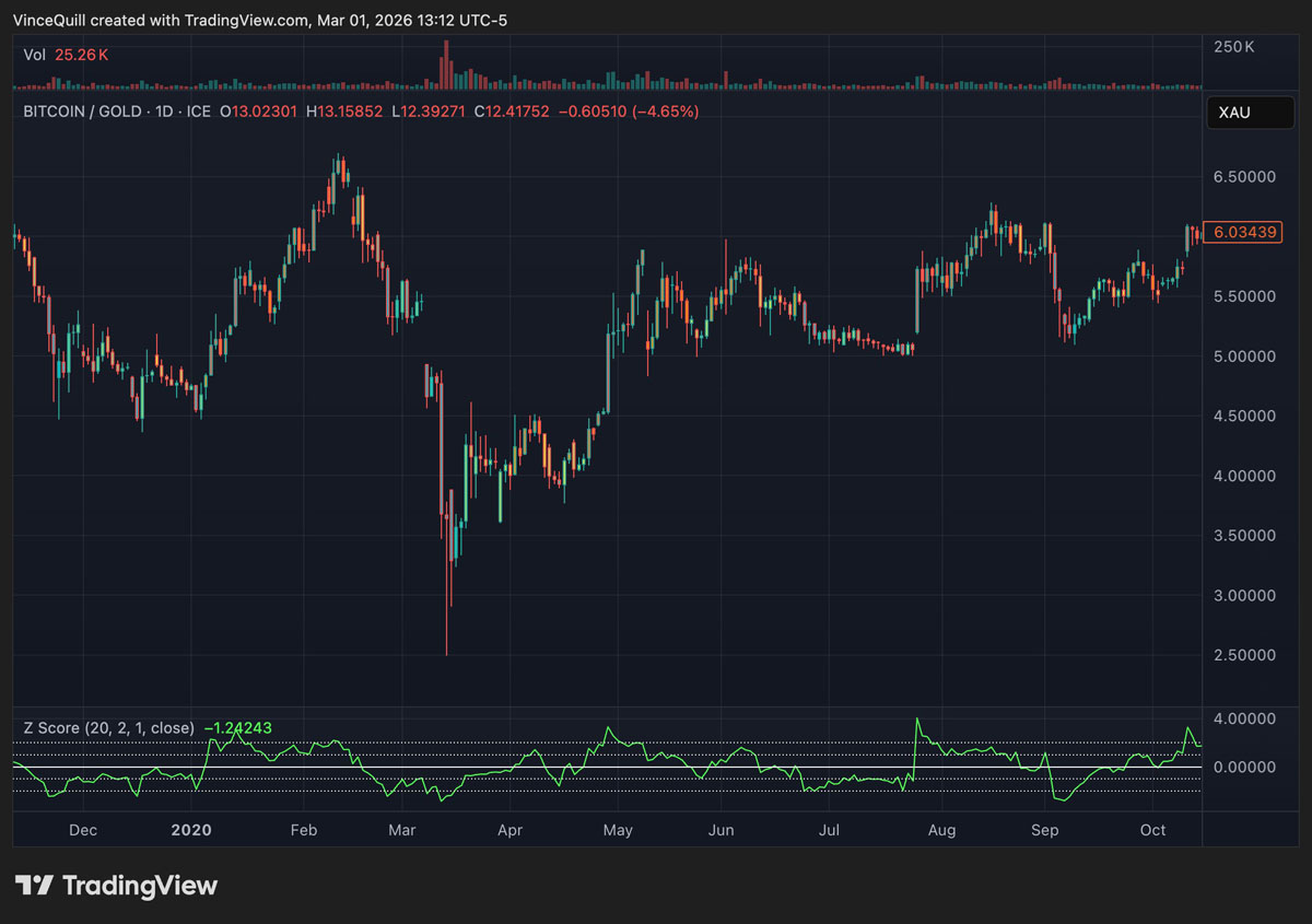 截至撰写本文时,比特币与黄金比率的Z分数约为-1.24。