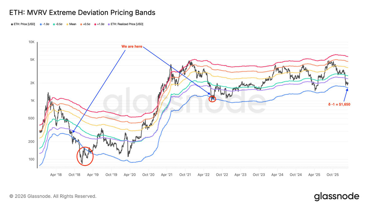 在过去的熊市中,ETH 总是跌破最低 MVRV 区间,正如 2018 年和 2022 年所见。