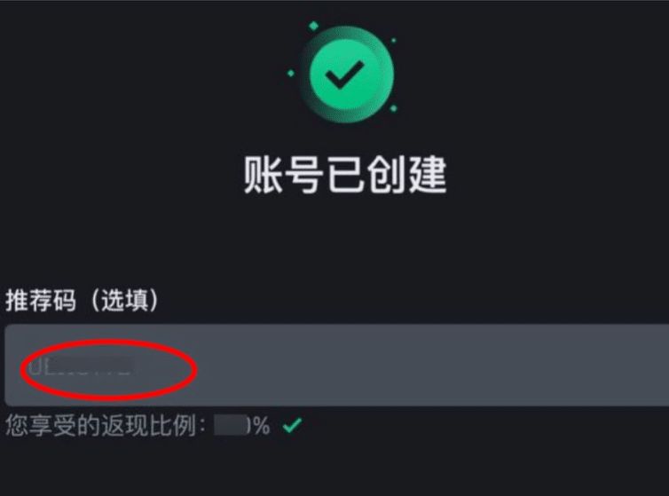 注册成功后页面会显示本次使用的推荐码及返佣比例。 使用本站推荐码A0Y8K980可获得终身 20% 手续费返现。