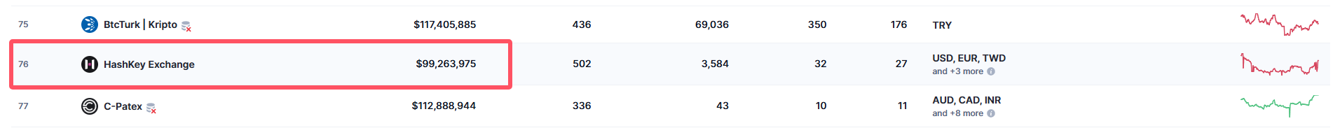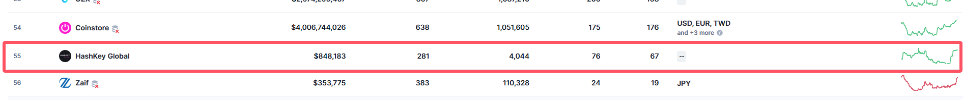 根据CoinMarketCap数据显示,HashKey Global 和 HashKey排名在55和76,在国际上,此篇此排名不算好,但是他是合法交易所,所以在安全上是有一点保障的!