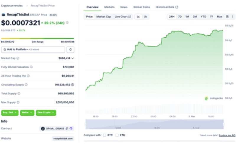 RecapThisBot (RECAP) 是一个在Solana 生态系统内的微型市值迷因币,最近经历了显著的价格动能。当前价格为$0.0007321,并且每日增长39.2%,该项目正在吸引投机交易者的关注。
