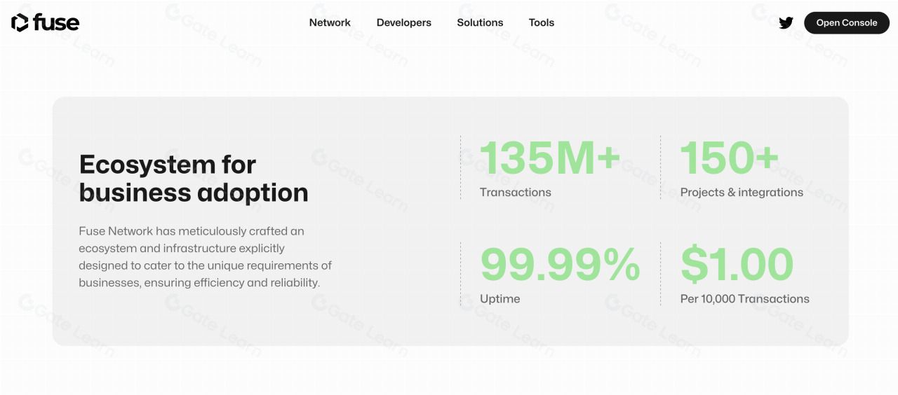 官网最新数据展示,目前 Fuse 已经完成了 1.35 亿笔的交易,Fuse 生态集成的项目也超过 150 家,整个准备率达到 99.99%,并且其中每一万笔交易 Fuse 费用只有 1 美金,可见其支付成本非常低,几乎可以忽略不计。