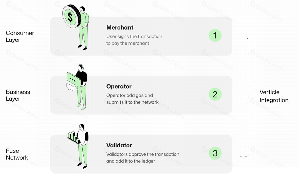在 Fuse Stack 中,中继器、账户管理、钱包API、验证等服务都依赖于链上逻辑外部的各种中间件服务。Power Validators 负责为 Fuse 平台的支付基础设施提供支持,同时还积极验证交易,通过在现有验证器角色之上运行额外的去信任中间件(作为 Fuse 网络的一部分)来进一步分散业务流程。